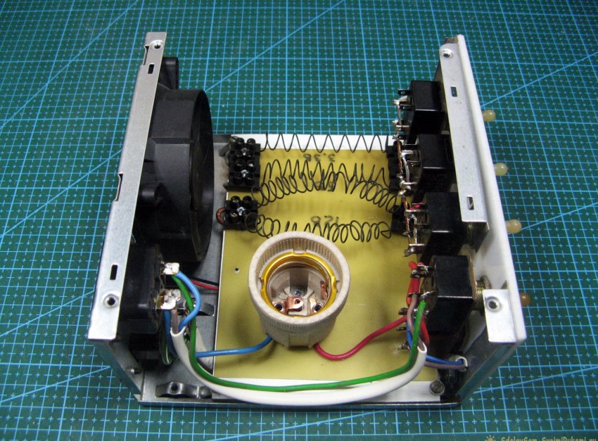 Распаиваю провода согласно схеме. Тумблер шунтирует лампу. Распаял вентилятор, на схеме его нет, на 12 вольт. Получается. Как только подключен проверяемый блок питания и 12 вольт исправны, то он вращается. Вентилятор работает на выдув.