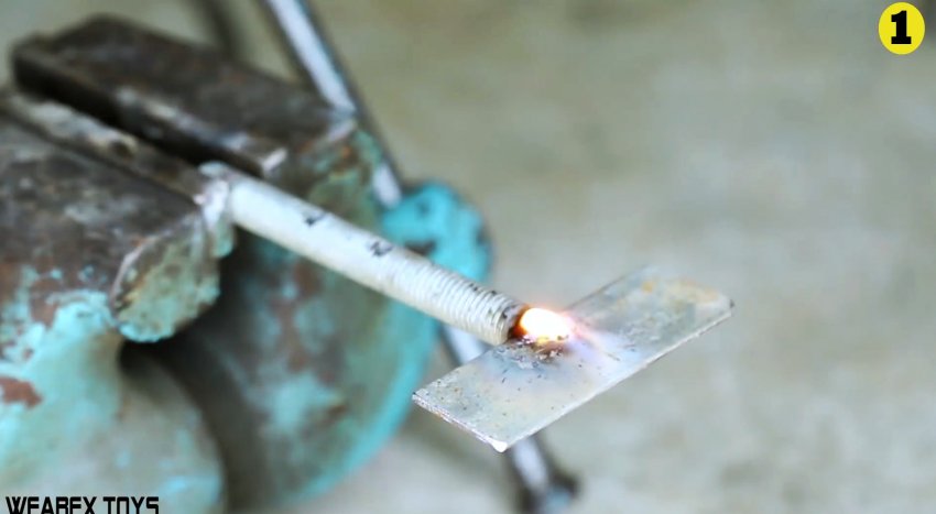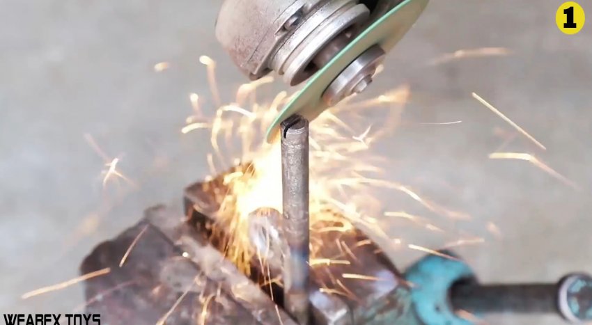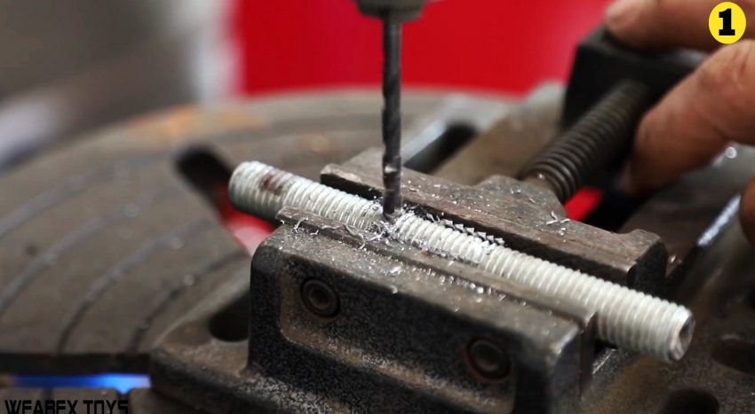 Далее берется отрезок резьбовой шпильки длиной 10-15 см. Ее требуется просверлить сверлом 3-4 мм в двух местах ближе к центру с зазором в 30 мм. Затем на торец шпильки перпендикулярно приваривается отрезок полосы, чтобы получить ручку.