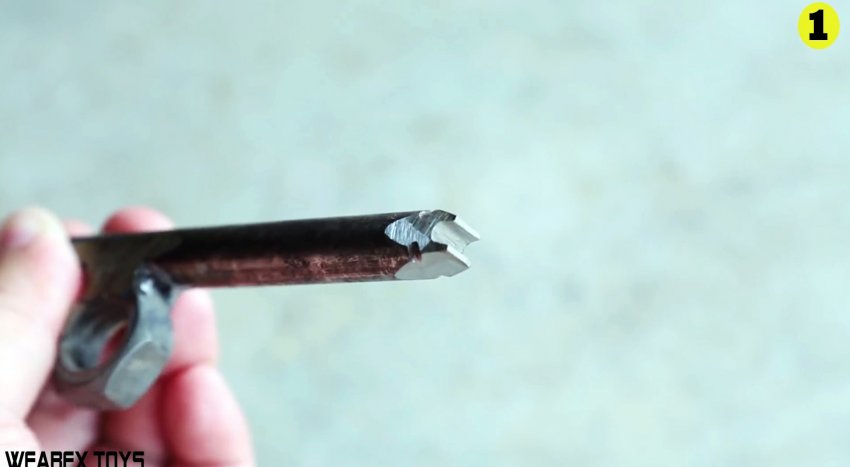 Затем его край нужно проточить, сделав продольный пропил с двумя зазубринами.