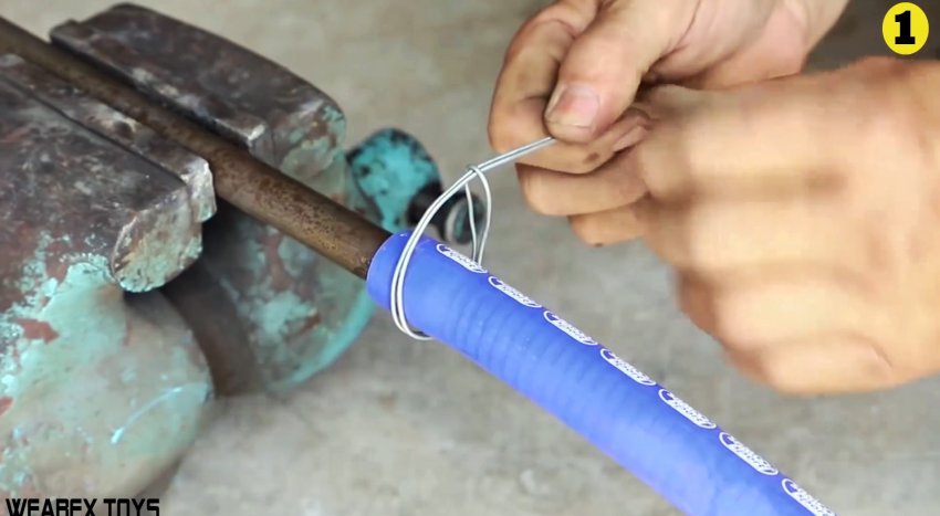 Чтобы воспользоваться устройством, необходимо согнуть пополам кусок проволоки. Полученная из нее петля затягивается на шланге.