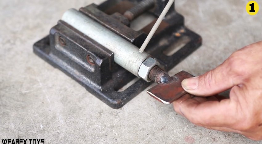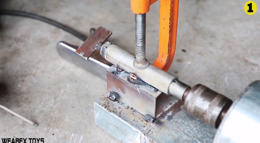 Затем в центр одного из них строго перпендикулярно вваривается пруток длиной 200 мм.