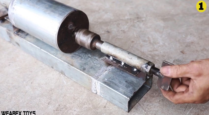 На второй край станины приваривается уголок. Непосредственно к нему приваривается перед этим сделанная трубка с вставленным внутрь станочным вращающимся центром. Все выставляется так, чтобы при вкручивании болта центр прижимал заглушку к галтовочной камере.