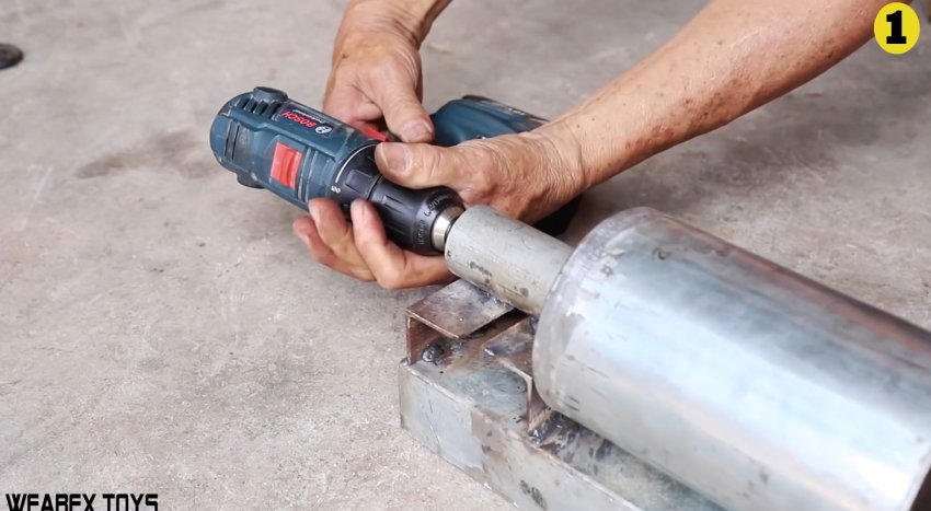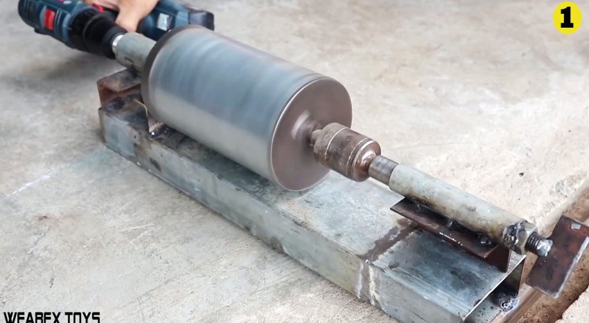 Шток барабана зажимается в патроне дрели, и та запускается.