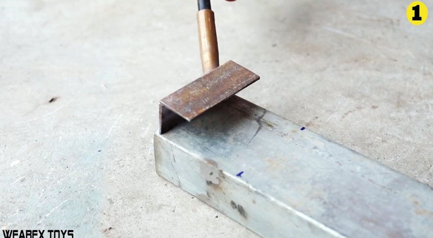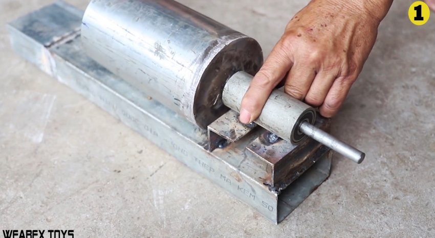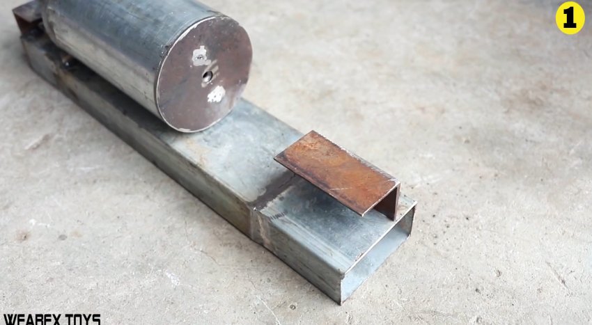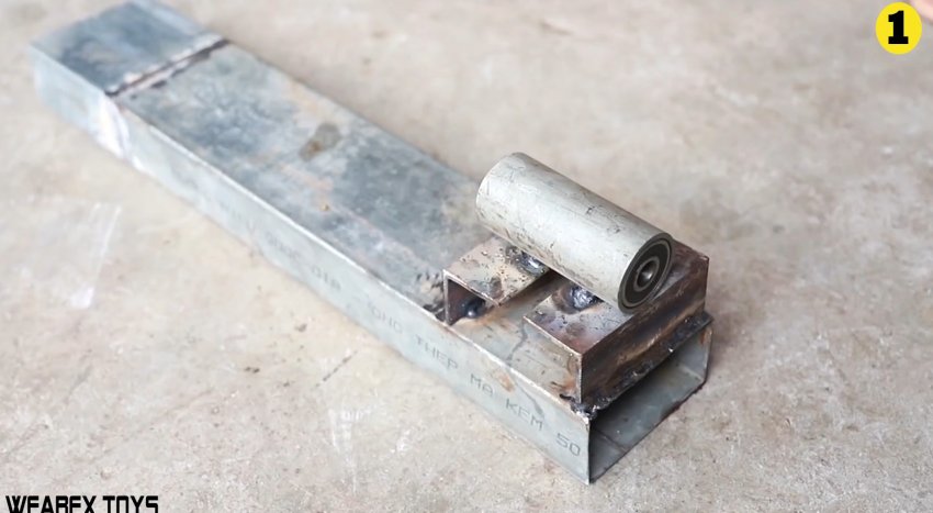 Затем изготавливается станина. Она представляет собой длинный отрезок профильной трубы 100х40 мм. С краю на нее наваривается поперек 2 отрезка уголка. Они нужны, чтобы создать основание, и вварить на него сверху трубку с подшипниками.