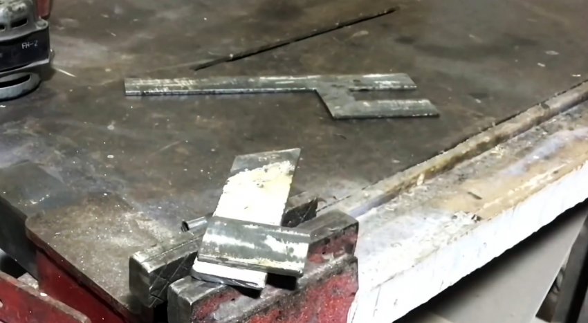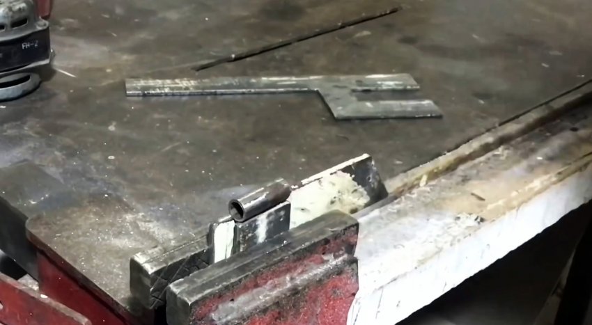 Теперь предстоит сделать крепление для ведомого ролика с механизмом натяжения. Для этого необходимо вырезать 2 заготовки из полосы. Одна делается длиной примерно 50 мм, а вторая 10 мм. Они складываются вместе под прямым углом через проставку из тонкой шайбы. Затем к ним приваривается трубка, но только по ее краям.