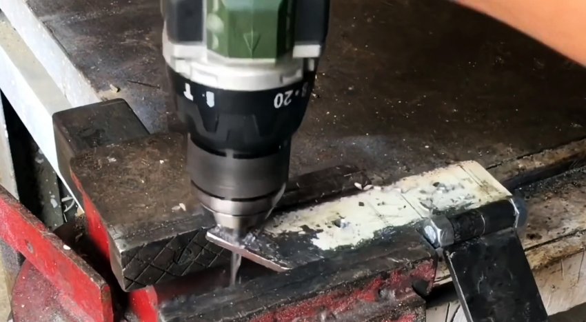 Элементы петли соединяются между собой болтом. Затем нужно просверлить 2 отверстия в длинной части механизма. Одно делается почти с краю, второе напротив малой створки. В последнем нарезается резьба. Также нужно будет просверлить h-образную станину вверху, чтобы присоединить к ней механизм регулировки.