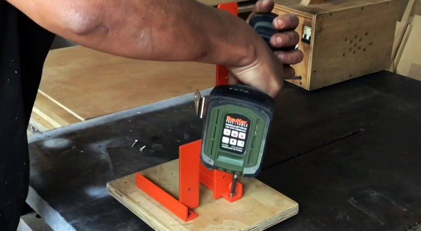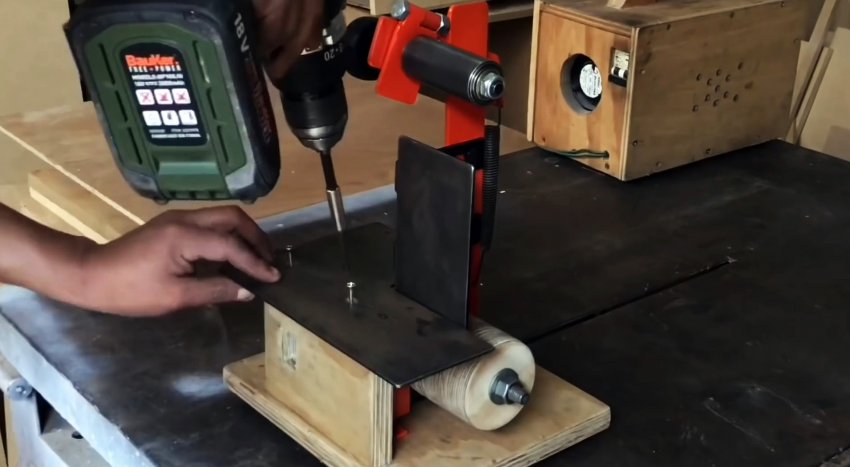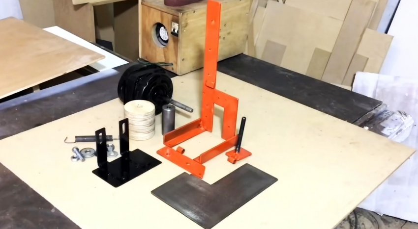 В завершение нужно выпилить из фанеры подошву станка, чтобы крепить к ней станину. Также из фанеры делается квадратная стойка для Г-образного шлифовального столика, который вырезается из листовой стали. Затем детали окрашиваются и собираются.