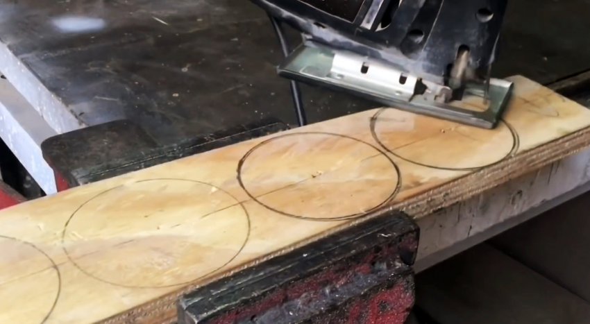 Далее необходимо изготовить ведущий ролик станка. Для этого вырезается из фанеры несколько дисков, чтобы сложить их вместе, и получить ролик требуемой ширины для выбранной ленты. Заготовки склеиваются вместе. Затем после высыхания клея ролик можно надеть на удлиненный вал двигателя, и обточить на нем.