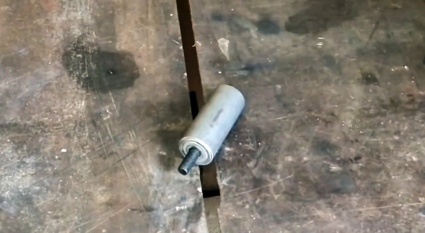 Разрезав трубку после сварки пополам, можно получить подобие дверной петли. В короткой ее части просверливается отверстие, и в него вваривается шпилька, которая послужит осью вращения для ведомого ролика.