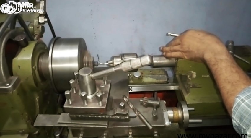 Затем замеряем диаметр вала двигателя. В данном случае у 775 мотора он составляет 5 мм. Болт устанавливается в токарный станок, и просверливается вдоль сверлом 5 мм.