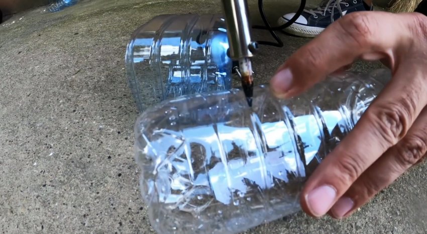 В отрезанное дно помещается меньшая пластиковая бутылка. В ней необходимо проделать отверстие на 10-15 мм ниже бортика подставки.