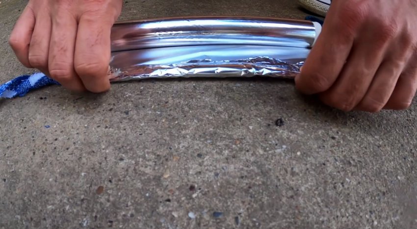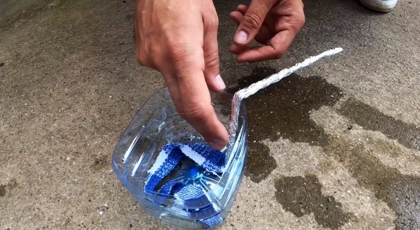 Лоскут в фольге помещается в подставку из дна бутылки.