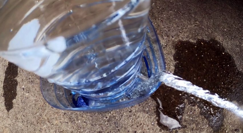 Ткань при этом ложится внутрь. Сверху ставится бутылка с водой, в которой ранее проделано отверстие. Теперь если открыть крышку, то вода будет набираться в подставку. Как только отверстие затопит, крышка зажимается, чтобы прекратить поток.