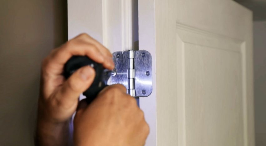 Дверные петли прикручиваются короткими шурупами, поэтому петли зачастую и разбалтываются. Очень надежно проблему решает их замена на длинные саморезы. Желательно, чтобы у них была аналогичная по размеру шляпка. Можно просто выкрутить короткий шуруп, и используя его в магазине как образец, купить длинный с такой же головой и цветом.