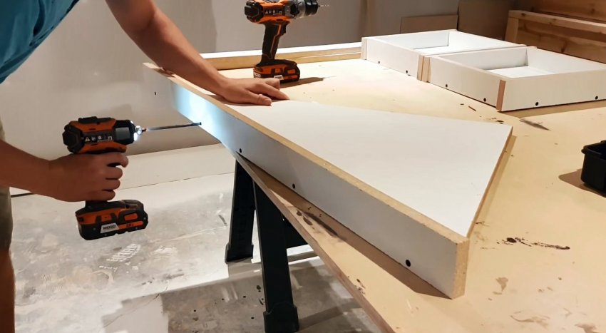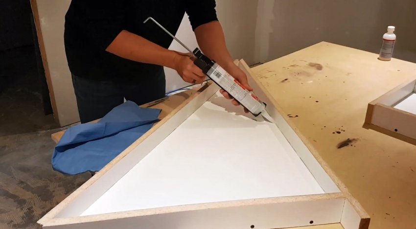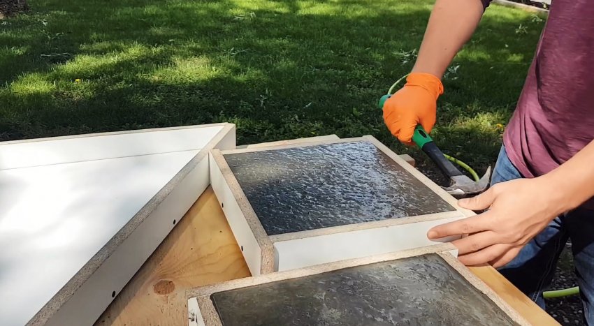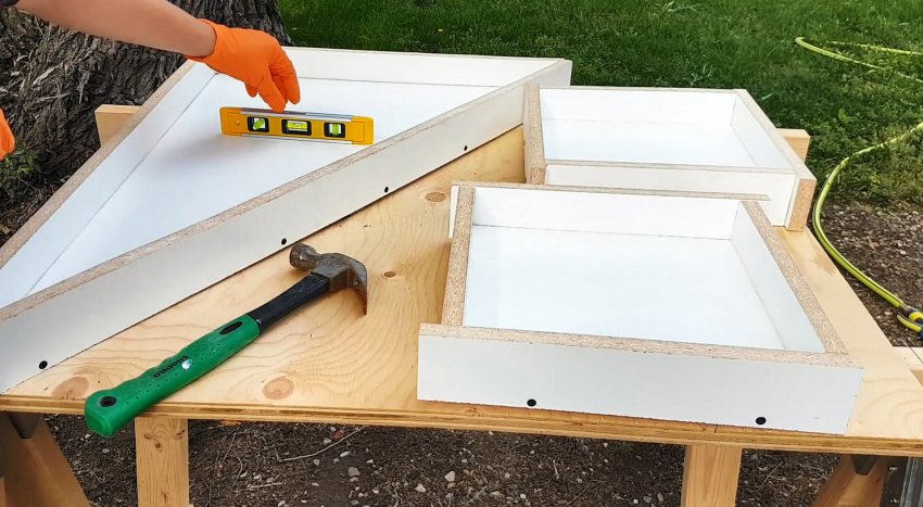 Затем напиливаются рейки, чтобы сделать бортики. Высота плитки должны быть не менее 5 см. Рейки нужно резать с учетом этих 5 см и толщины ЛДСП. Затем бортики прикручиваются с боков на заготовленные донышки.