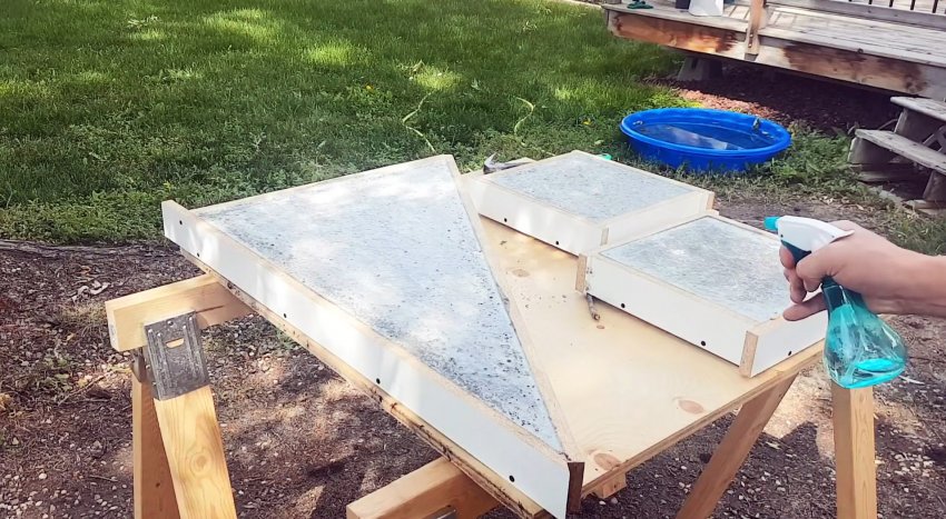 Дно форм смазывается разделителем. Это может быть вазелин, отработка. Затем углы герметизируются силиконовым герметиком. Он прилипнет только к бортам, поэтому в дальнейшем не помешает разбирать формы.