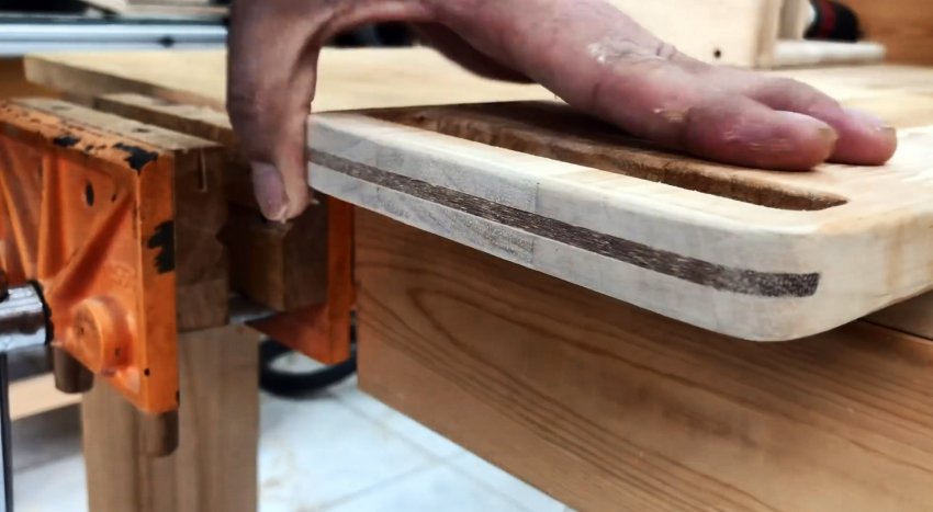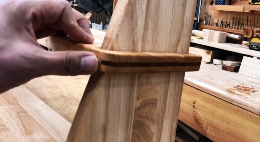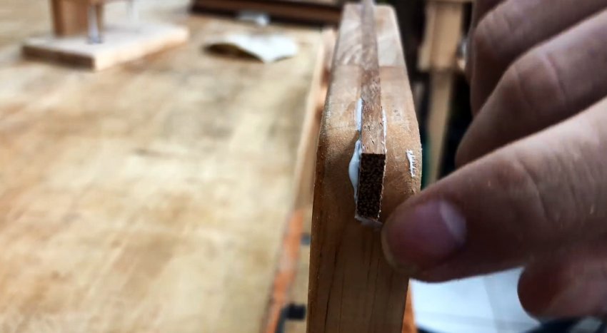 Для этого с торца клееного изделия пропиливается циркулярной пилой паз. Затем под его размер из цельного куска любого пиломатериала в продольном направлении выпиливается ламель.
