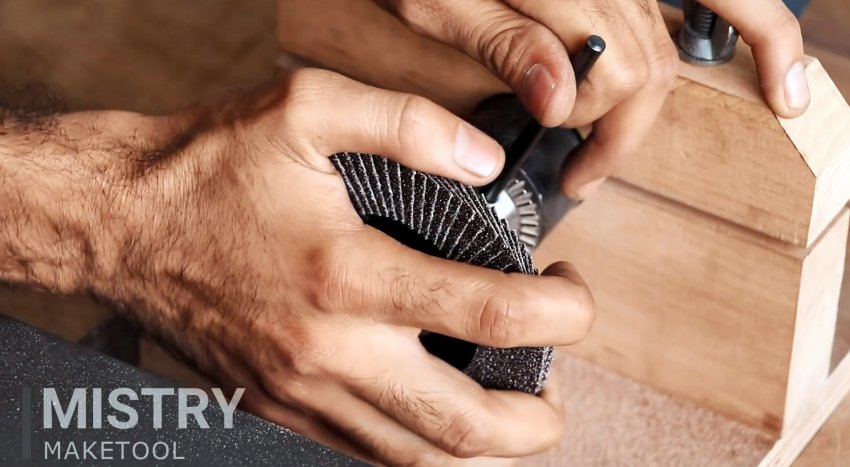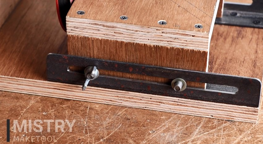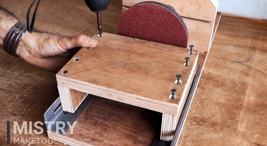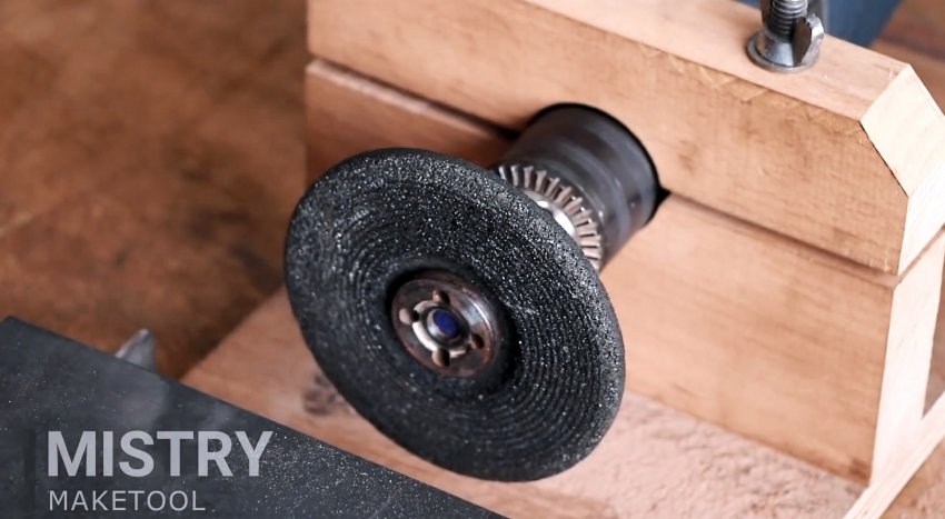 Теперь станок может использоваться по назначению. Отодвигая столик, можно менять оснастку. Это может быть диск с липучкой под наждачную бумагу или лепестковый круг. Последний зажимается на переходнике с помощью гайки от болгарки.