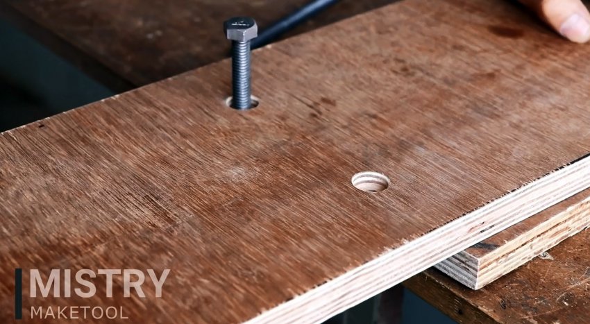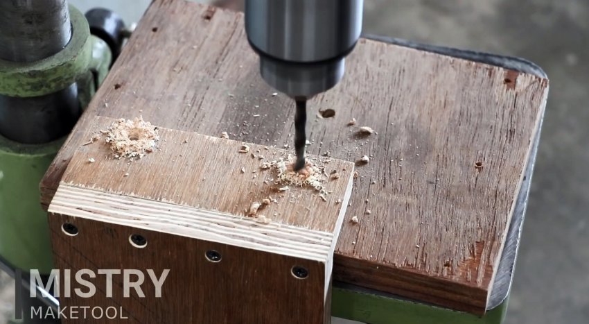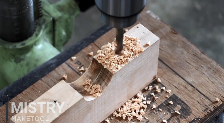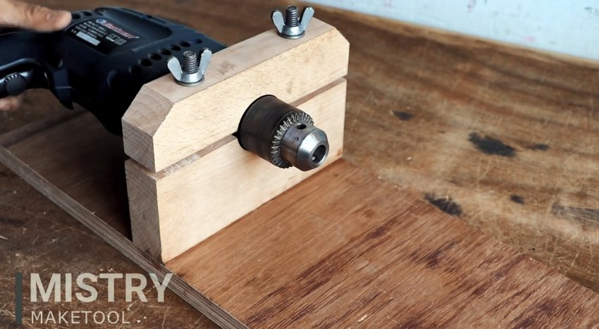 Бруски сжимаются струбциной вместе с ней, после чего просверливаются в центре коронкой. Диаметр той должен соответствовать сечению корпуса дрели за патроном, где устанавливается съемная рукоять.