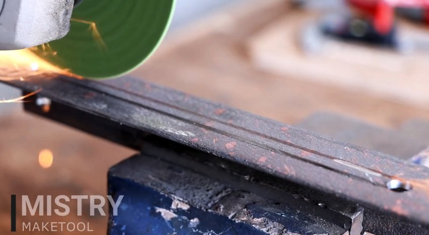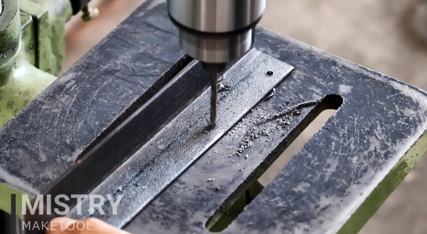 Ориентируясь по его расположению, готовятся 2 отрезка уголка. Они просверливаются по одной полке, чтобы прикрутить их к подошве. На второй полке в них выпивается паз.