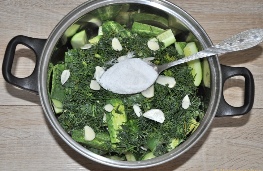 4. Нарезанные огурцы с зеленью и солью тщательно несколько раз перемешайте (лучше всего руками), чтобы овощи равномерно просолились.