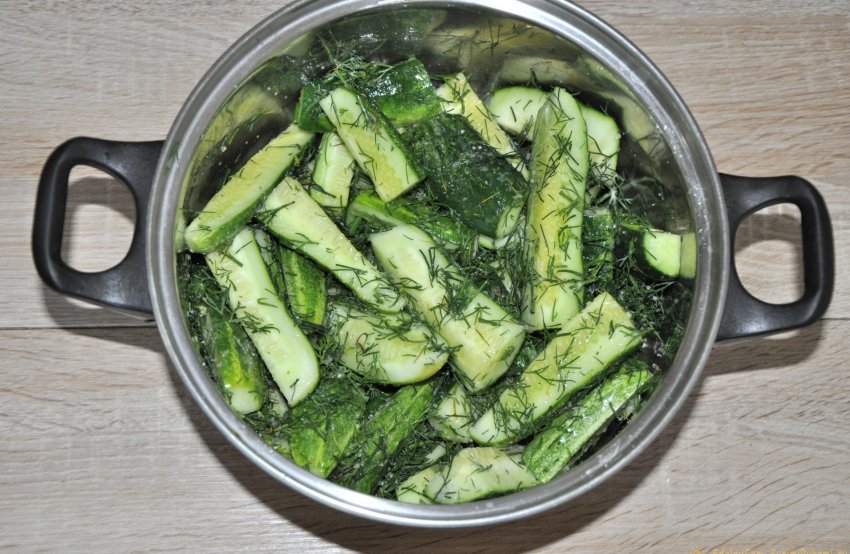 1. Огурцы для засаливания замочите на полчаса в холодной воде (для того, чтобы они остались хрустящими), затем хорошенько их помойте и нарежьте небольшими брусочками (четвертинками). Нарезанные огурцы сложите в кастрюлю.