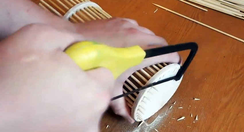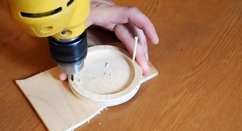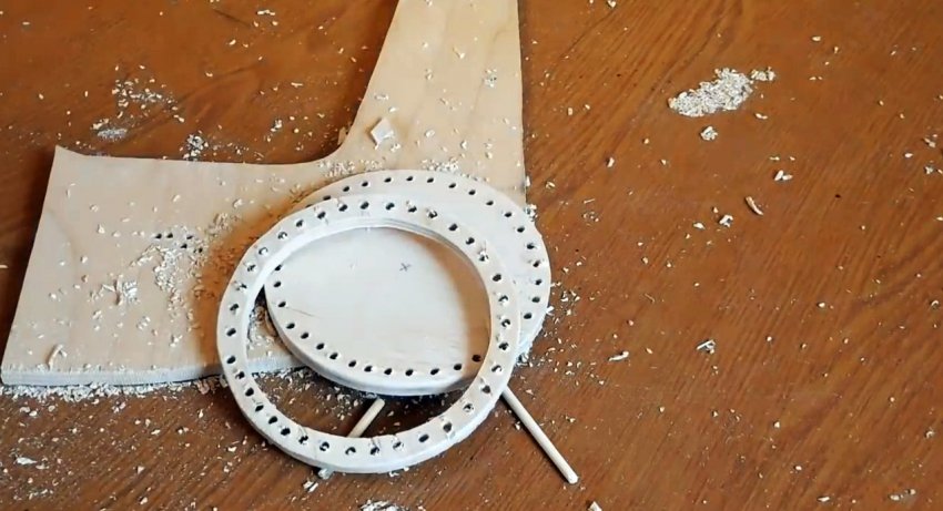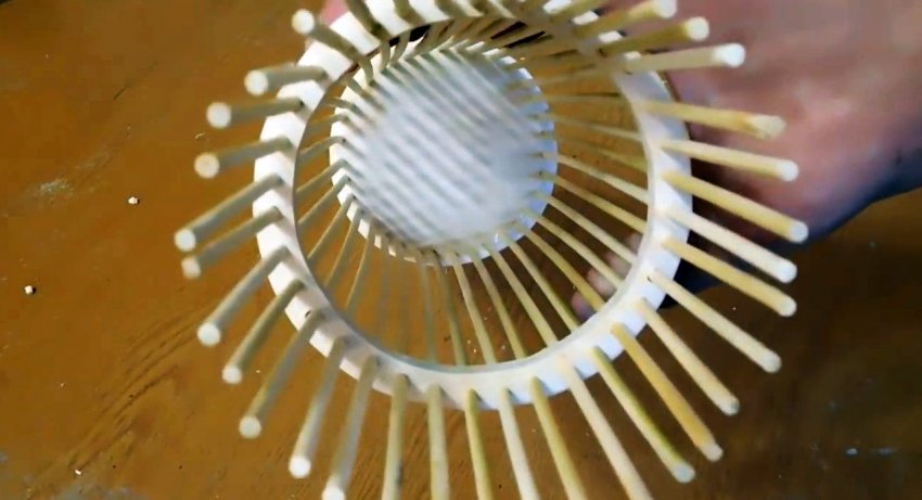 Заготовки после сверления шлифуются. Затем в них вклеиваются шпажки. Причем кольцо располагается не на краю, а так, чтобы зубья выходили за него на 5 см.