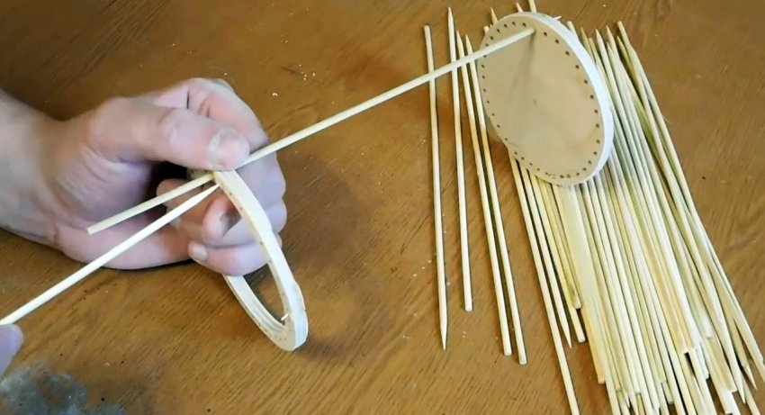Они складываются вместе и просверливаются по кругу тонким сверлом, равным по толщине бамбуковой шпажке. Расстояние между отверстиями должно быть немного меньшим, чем диаметр спелой ягоды.
