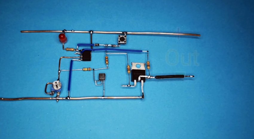 Схема собирается навесным монтажом. В роли шин питания использованы толстые металлические проводники. Слева вход питания с блока, справа выход на нагрузку.