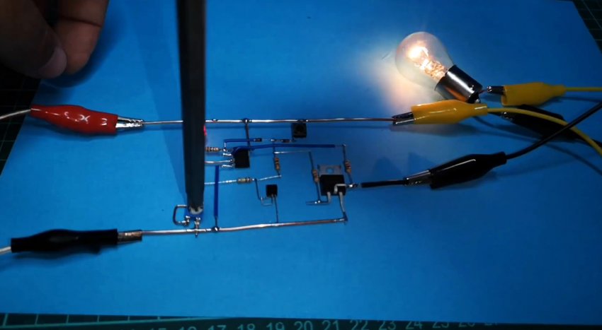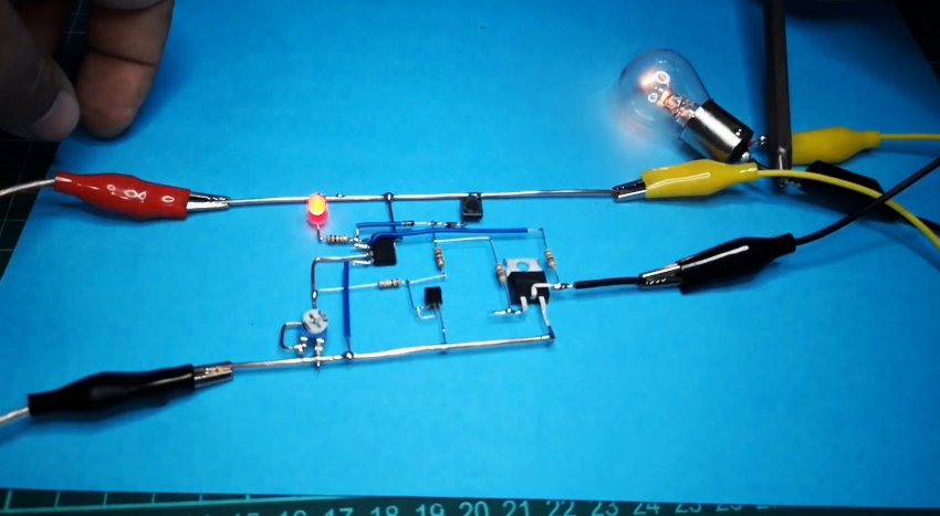 Подключаем схему в цепь. В роли нагрузки используется лампа накаливания. В роли источника - регулируемый источник постоянного тока на напряжение 5-15 В.
