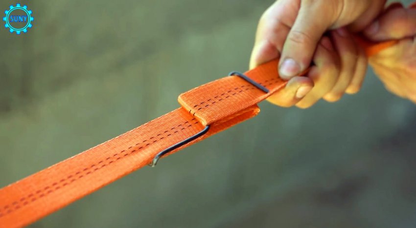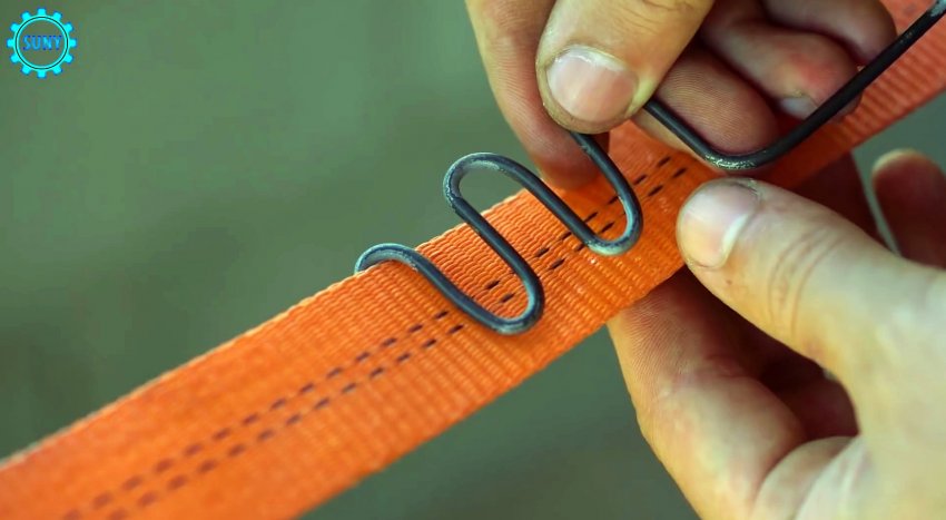 Теперь заводим ленту в крайние волны скобы, и делаем один оборот. С одного конца стропа зафиксируется хвостиком скобы, а с другого ее нужно ввести под первый виток змейки. Можно делать и больше оборотов. Пользуясь этой скобой, удобно подбирать лишнюю длину ленты. При этом намотка держится очень крепко, так что все можно без проблем натягивать.
