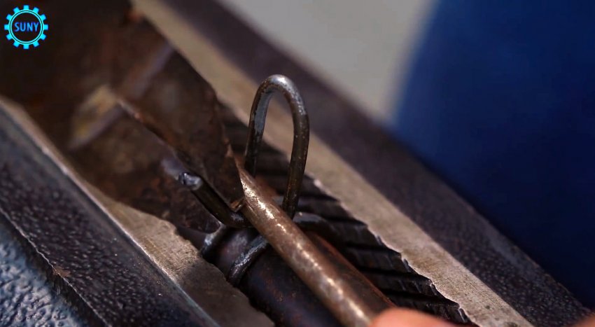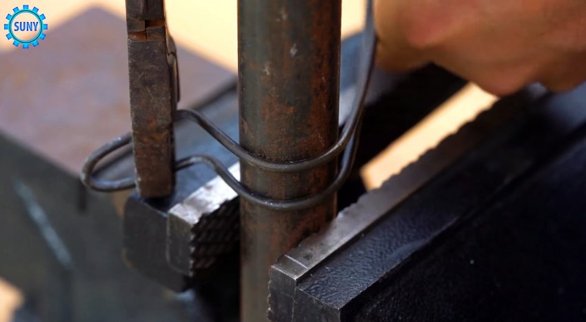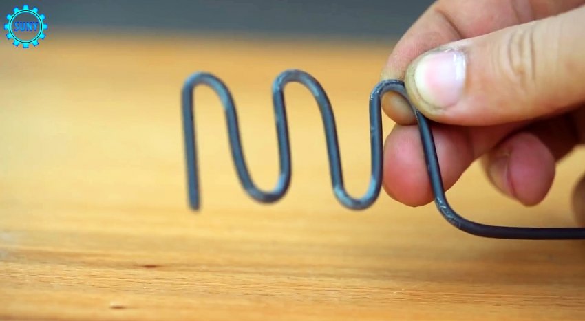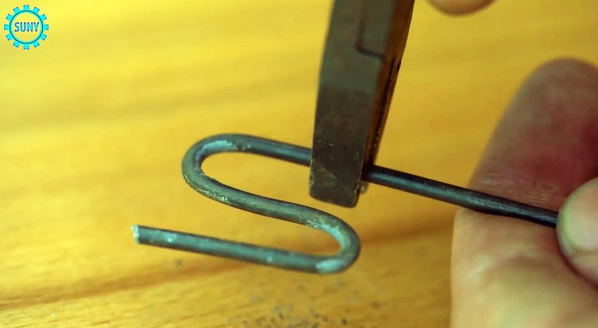Стальная проволока сгибается пополам. Край петли нужно зажать в тисках, и согнуть сдвоенный конец проволоки под прямым углом.