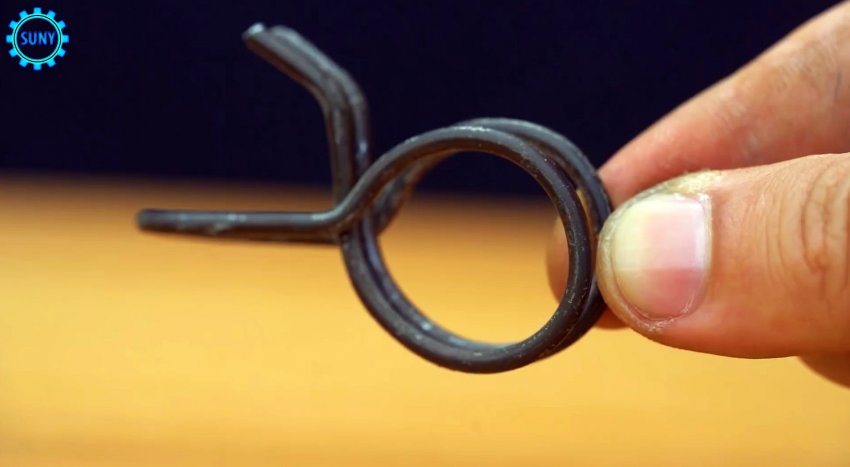 Концы проволоки нужно завести в петлю, и затем уложить между ней и ними пруток. Последний нужен, чтобы выгнут хвостики, сформировав прищепку. Теперь сжимая края хомута плоскогубцами, можно его расширять и ставить на шланг.