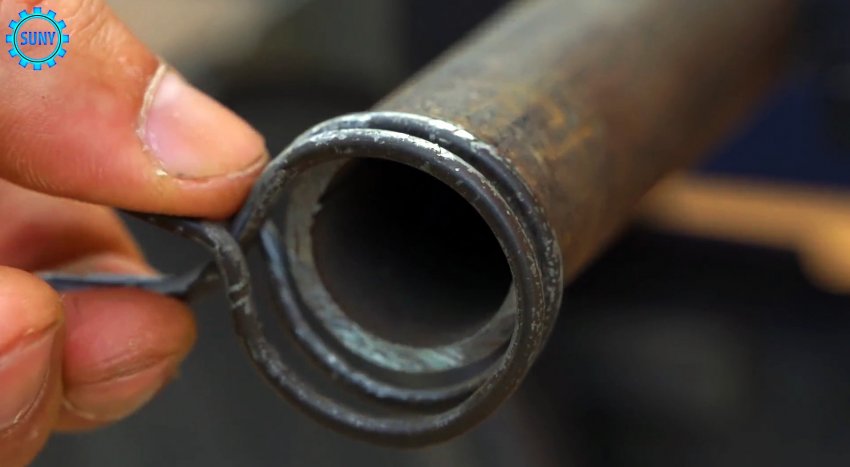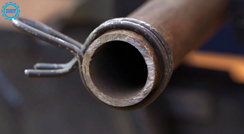 Хомут надевается на трубку и подбивается на изгибах молотком, чтобы сделать их более резкими. Сдвоенный край проволоки обрезаются по высоте петли.