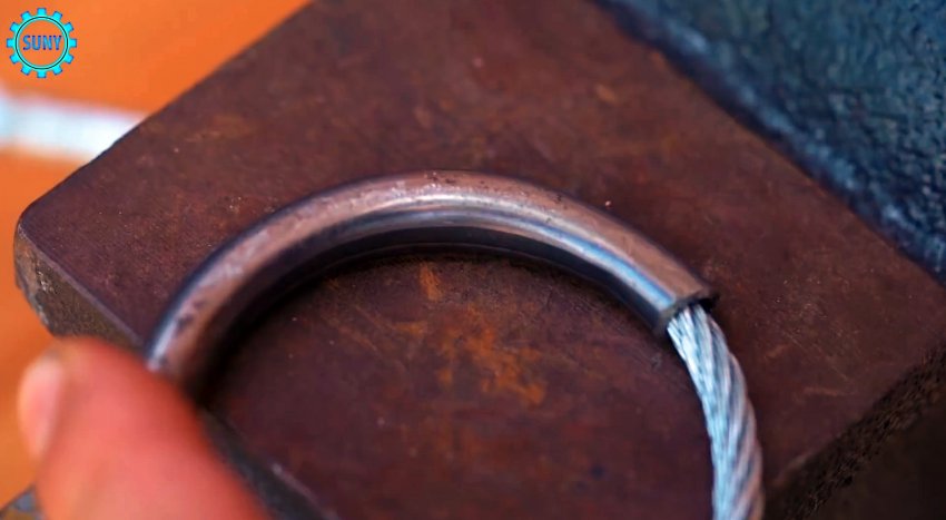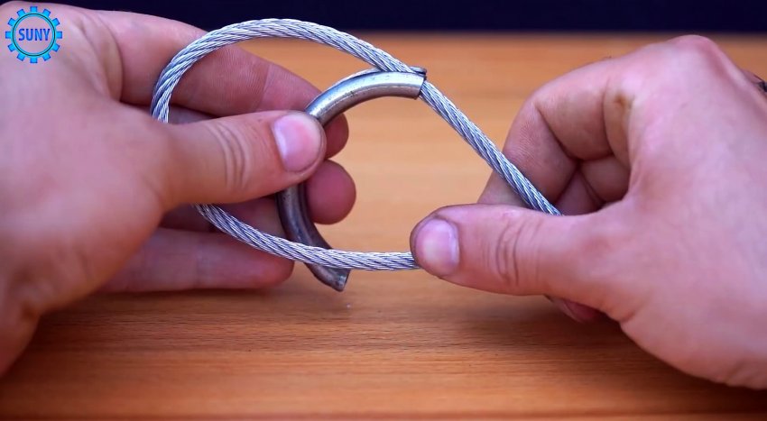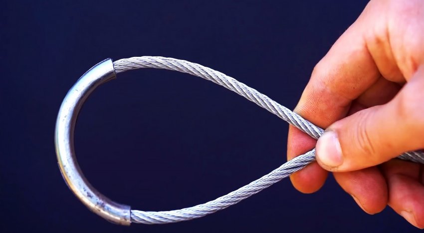 Заготовка коуша вставляется в петлю троса изнутри, затем сминается вокруг него молотком.