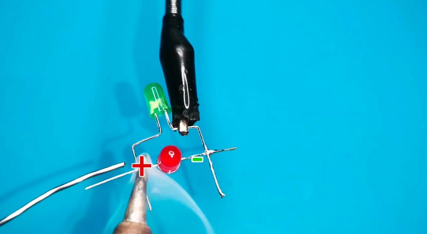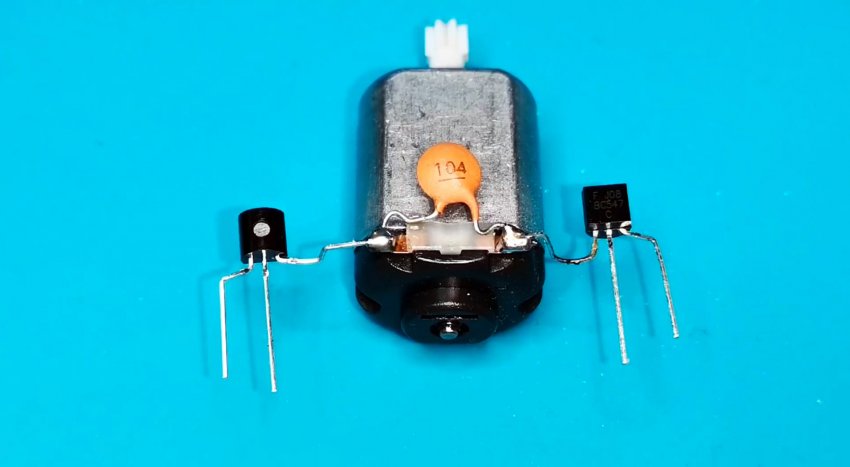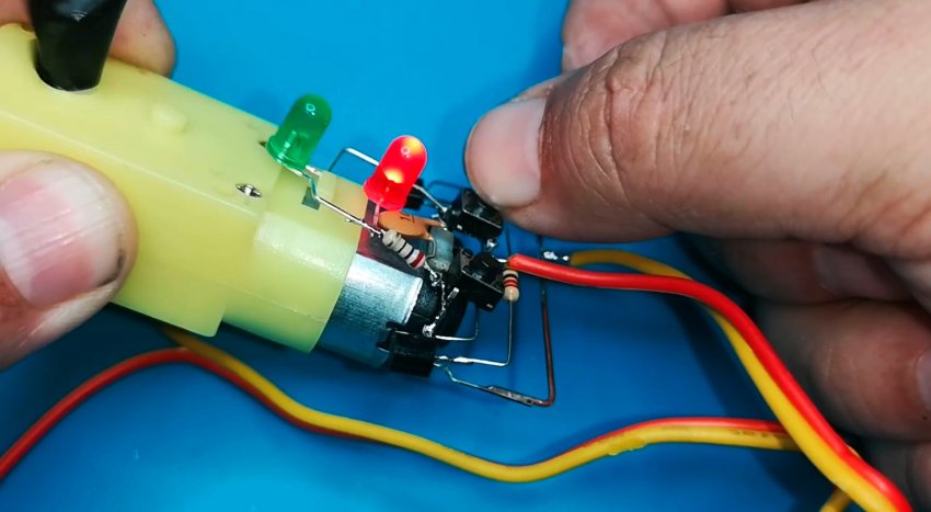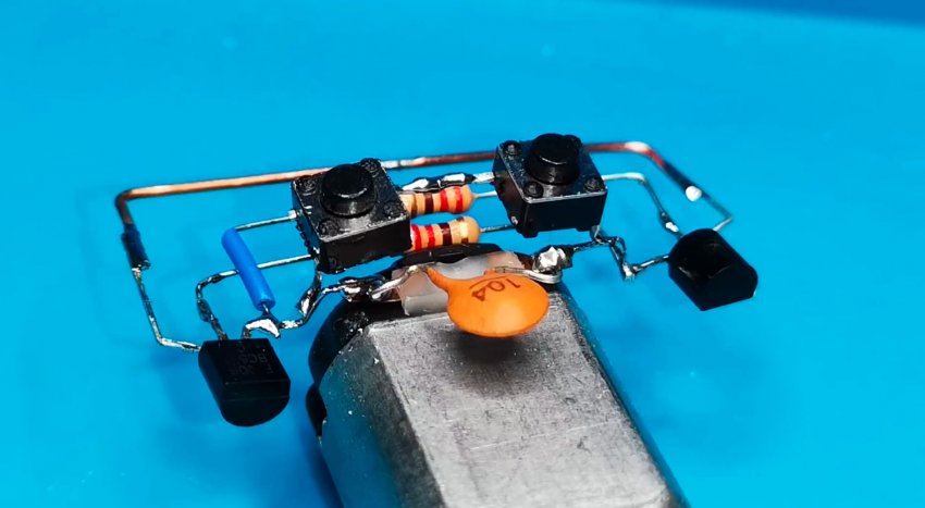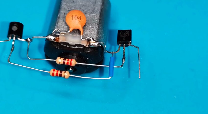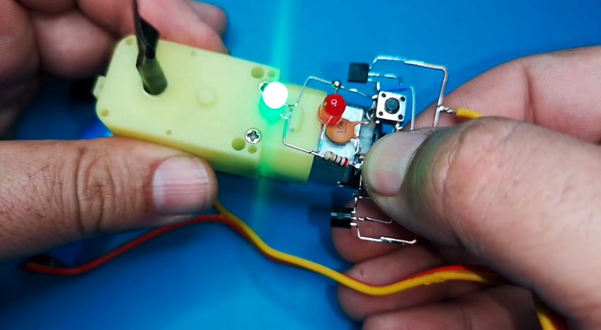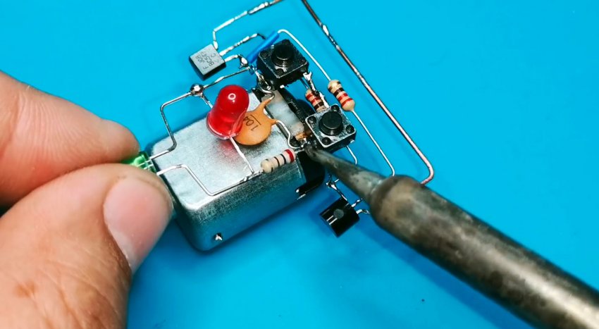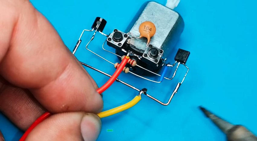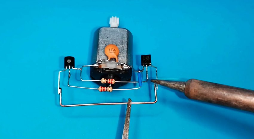 Из-за небольшого количества компонентов монтаж может быть выполнен на весу с пайкой выводов радиодеталей друг на друга и использованием в качестве несущей платформы электродвигателя. Выводы элементов в местах пересечения друг с другом следует защитить кембриками.