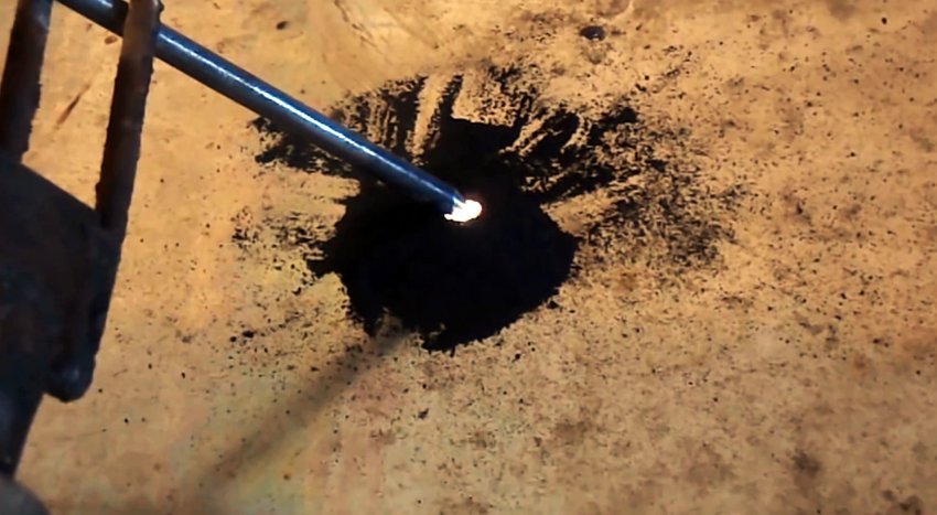 Высыпаем порошок на пластину, после чего зажимаем деталь, твердость которой нужно повысить, в держатель плюсового провода сварки. После этого касаемся заготовкой к графиту. Нужно буквально постараться опустить ту часть, которая должна сталь твердой, в порошок. В итоге возникает электрическая дуга. Графит от этого раскалится, но сама деталь при контакте практически не портится. Можно даже таким образом повышать твердость заточенного мягкого лезвия. Но нельзя допускать, чтобы заготовка напрямую коснулась металлической пластины под графитом, поскольку она расплавится.
