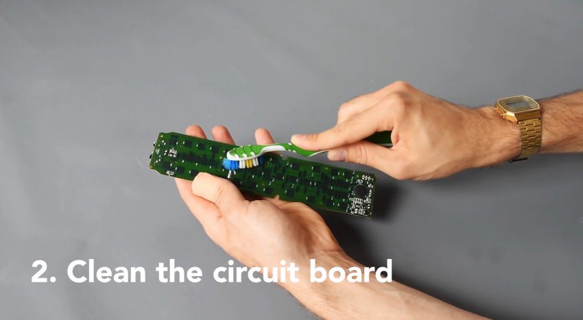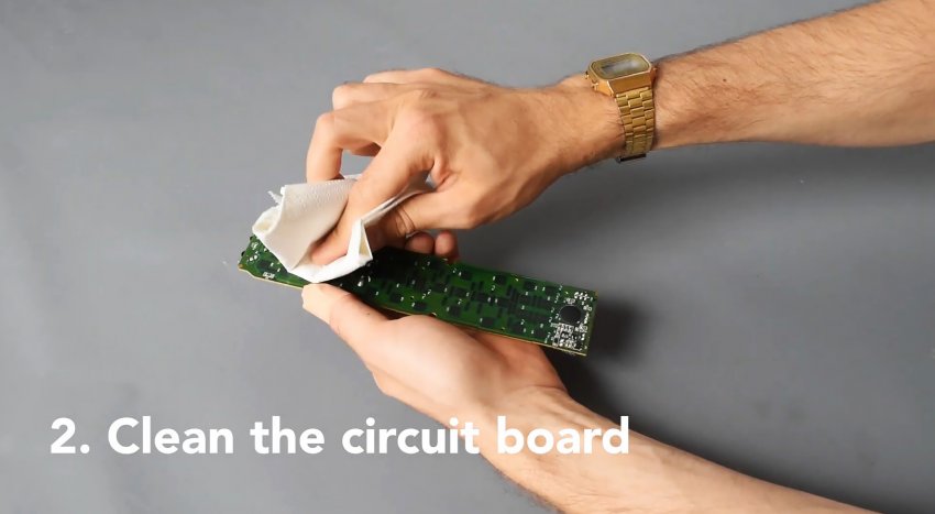 Салфеткой смоченной в спиртосодержащей жидкости, протираем контактные площадки кнопок на плате.