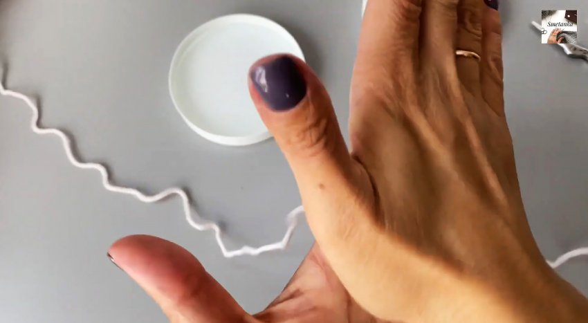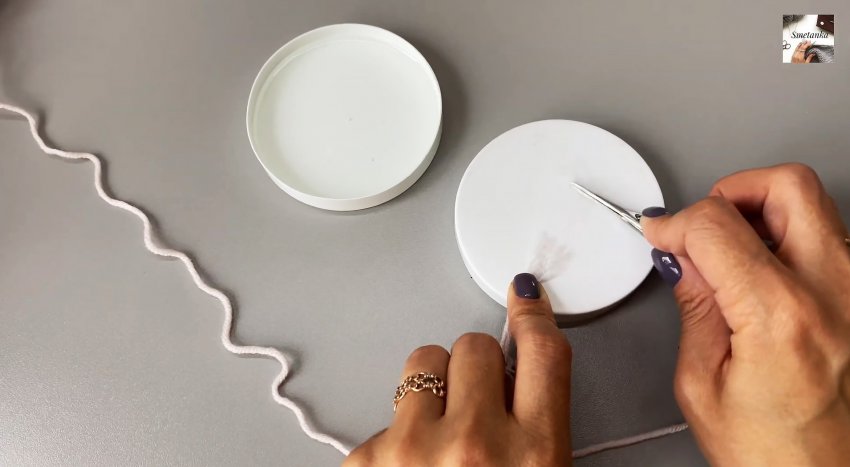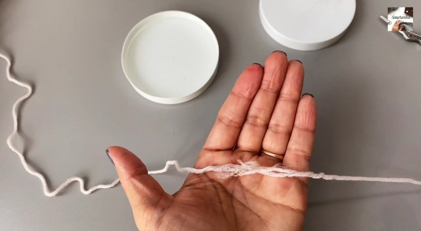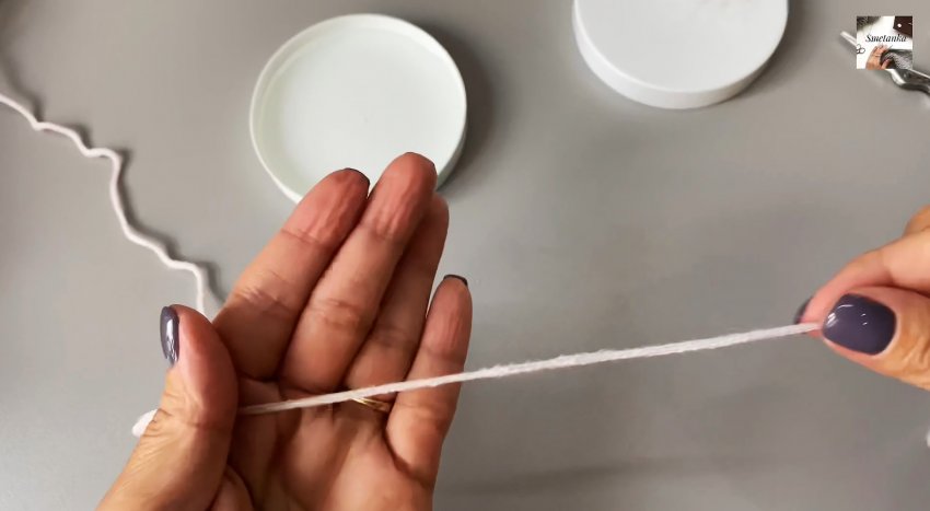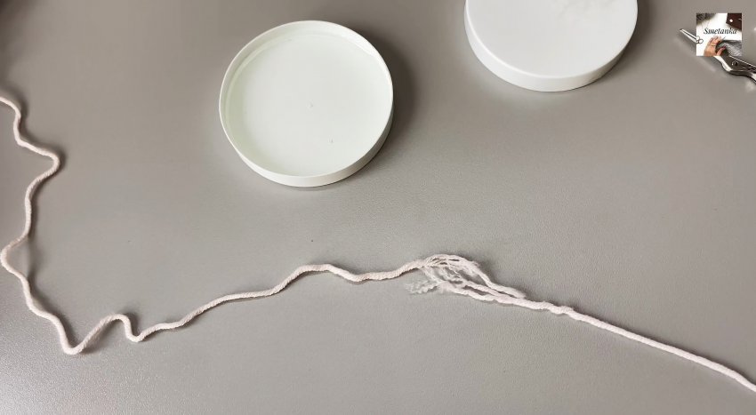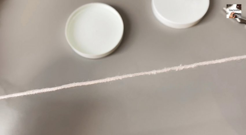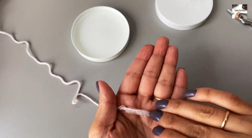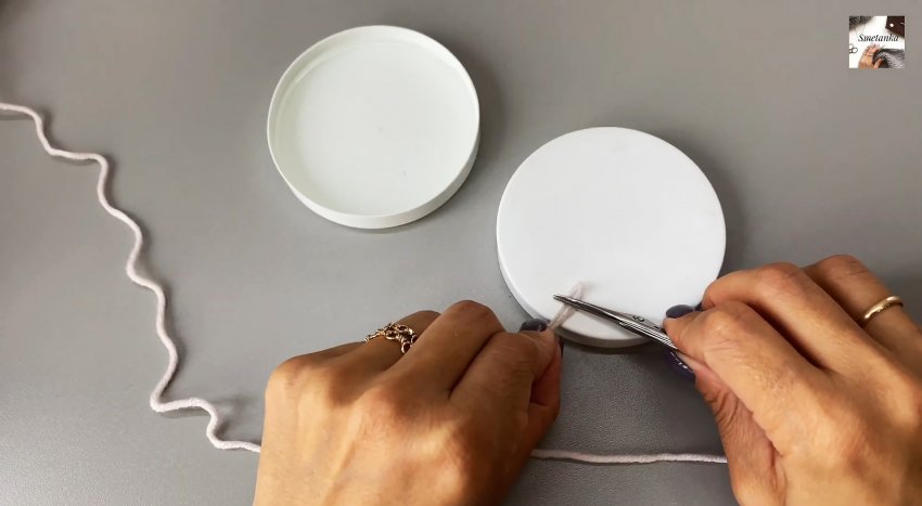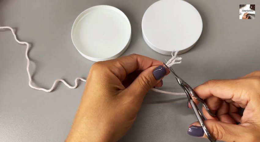 После этого берем каждую половинку по отдельности и прикладывая к ровной поверхности, к примеру, пластиковой крышечке, распушиваем. Просто скребем ножницами по нитке от себя, и ее волокна распушатся.