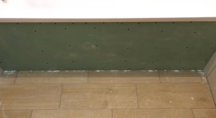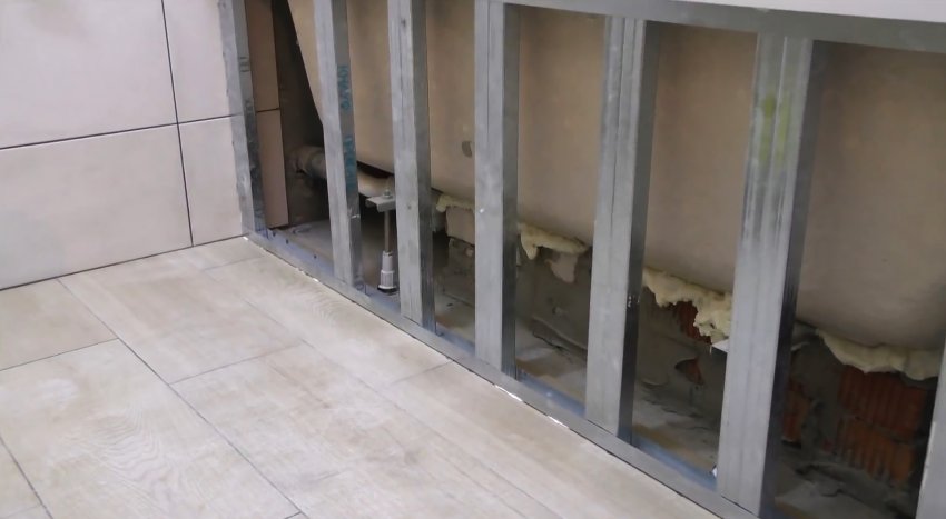 Затем ванна устанавливается на ножки. После этого нужно закрепить рамку каркаса. Не обязательно прикручивать профиль дюбелями. Можно не сверлить плитку, а клеить его на полиуретановый герметик.