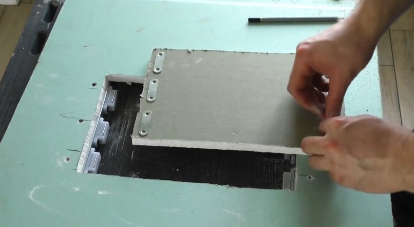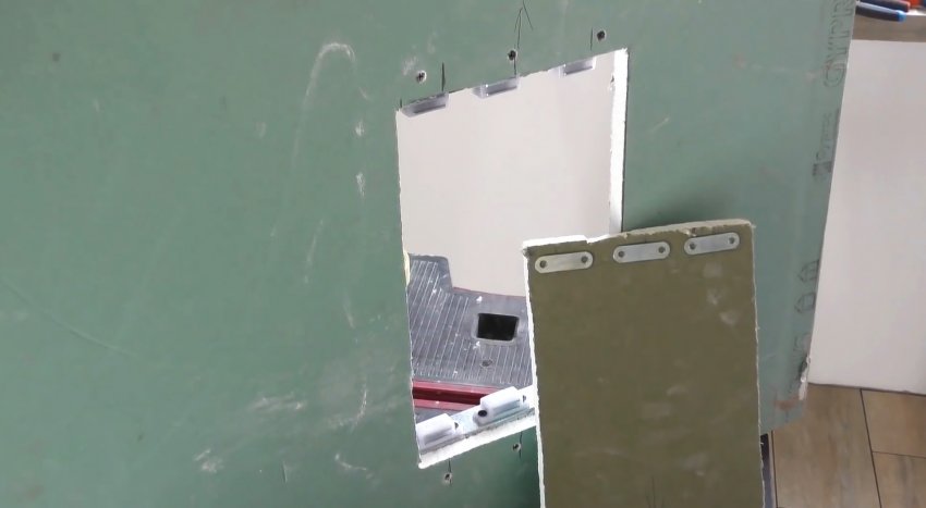 Между рамкой из UD устанавливаются стойки из CD профиля. Их нужно скрепить саморезами с прессшайбой. Затем на каркас прикручивается подогнанный по размеру лист гипсокартона с врезанным люком, или же тот делается после.