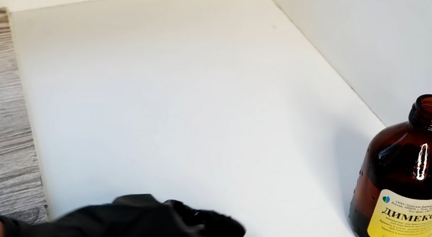 Затем на ватный диск или салфетку носится пара капель Димексида. Работать с ним нужно в перчатках. Необходимо растереть его по пожелтевшему пластику, и оставить на пару минут.
