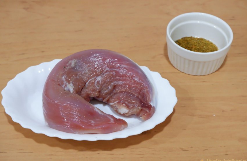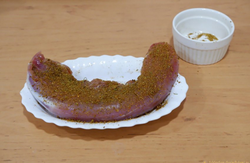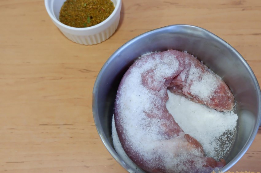 2. Выкладываем мясо в небольшую кастрюльку, посыпаем солью с двух сторон. Оставляем на 24 часа в холодильнике. За это время наше мясо хорошо просолится.