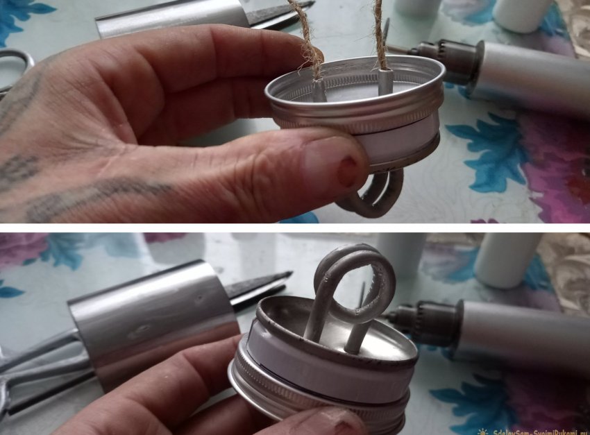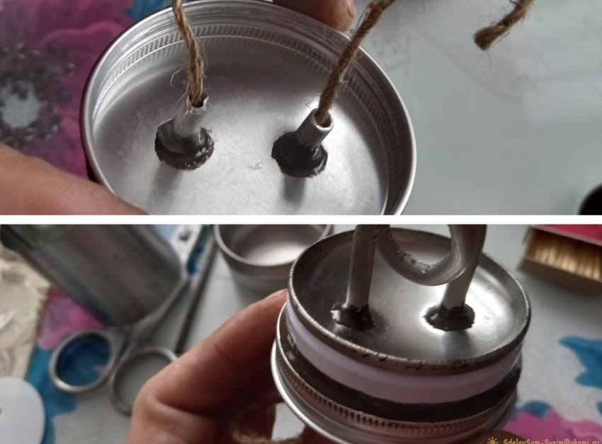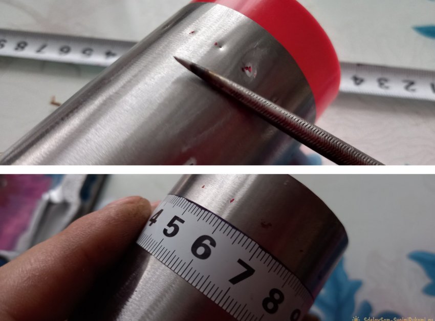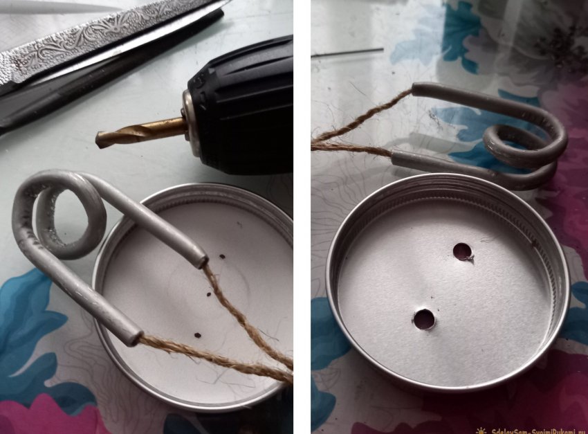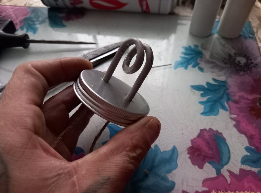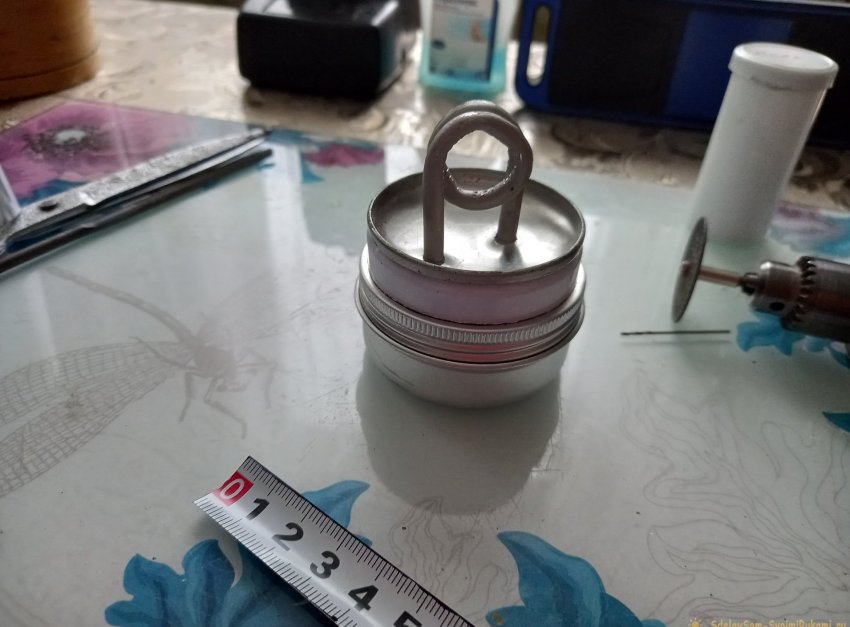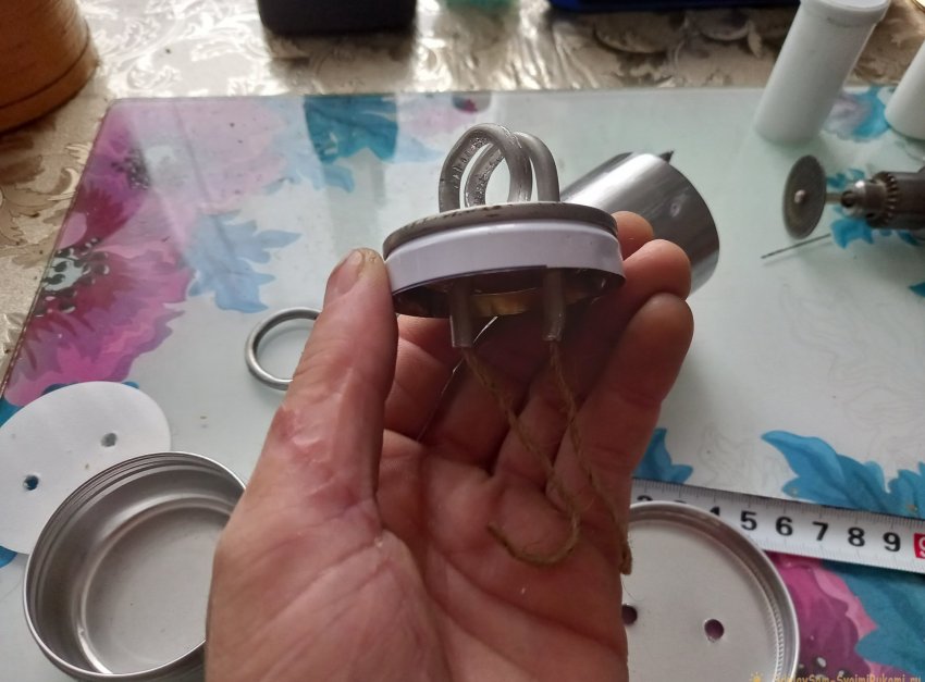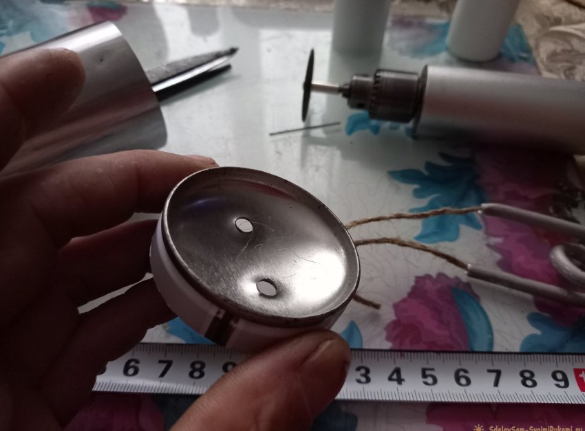 Далее подготовим емкость для спирта. Определяем на крышке центр, примеряем концы спирали по центру, отмечаем маркером места будущих отверстий, и сверлим.
