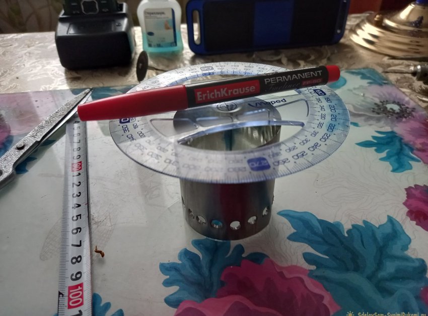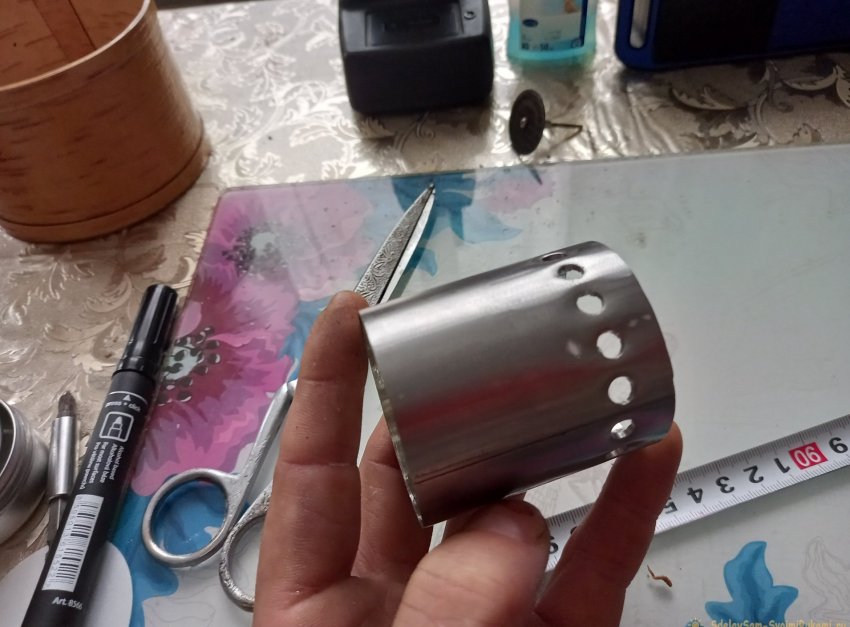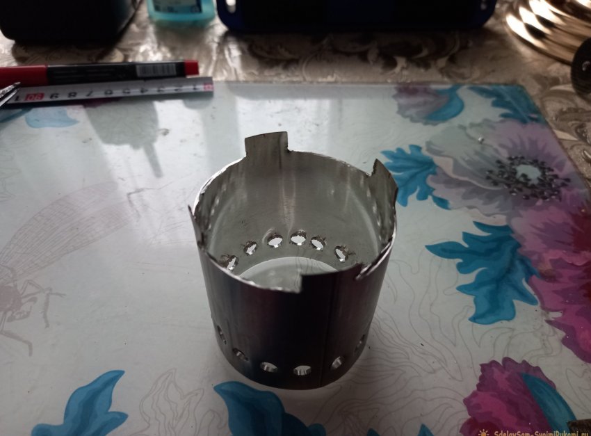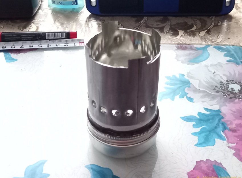 Клей этот можно приобрести в любом хозяйственном отделе. Сохнет он не менее суток, так что забываем о склеенной части горелки, как минимум до следующего утра. А пока займемся подставкой для кружки. Вырезанная 60-ти миллиметровая трубка от баллона идеально стыкуется с донышком этого же баллона, из которого мы ранее сделали поддон, так что все, что нам остается, это насверлить по нижнему краю отверстий для подачи воздуха, через каждый сантиметр. При помощи шила керним места сверления, и сверлим тем же сверлом, что сверлили отверстия для трубки.