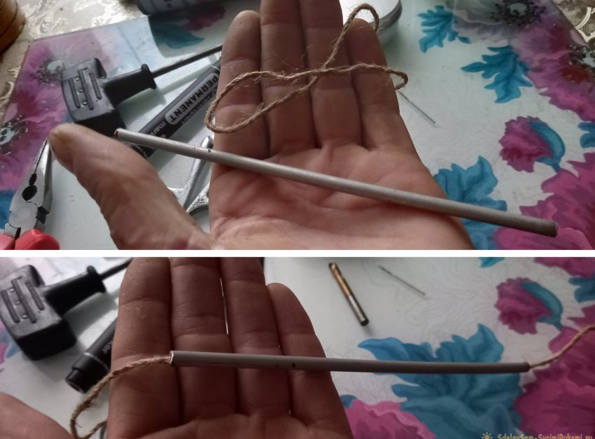 Для начала изготовим нагревательный элемент, который будет испарять спирт и поддерживать почти реактивное горение паров спирта. Для этого продеваем приготовленную льняную веревочку в трубку так, чтобы с обоих концов трубки оставался запас веревки примерно сантиметров по 5-7.