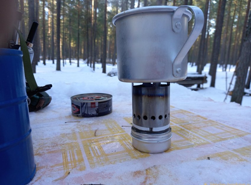 Пришел черед испытания нашего творения. В ближайшие выходные я отправился в небольшой поход и остался весьма доволен результатами проделанной работы! Половину алюминиевой кружки с водой (около 125 мл.), я вскипятил примерно за 10 минут. Еще 3 минуты ушло на подогрев консервы.