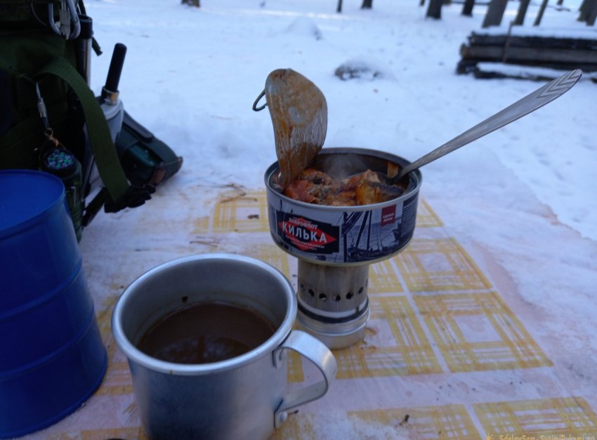 В общей сложности у меня ушло времени, чтобы выпить горячего чая и поесть теплой еды, около получаса. С костром я бы провозился не менее часа, теряя время и собственную энергию и тепло. А костер, он хорош на больших, обеденных привалах, дабы хорошенько обогреться, перед тем как отправиться в обратный путь после приятных посиделок на природе.