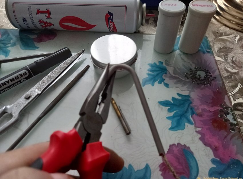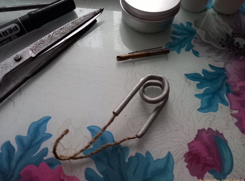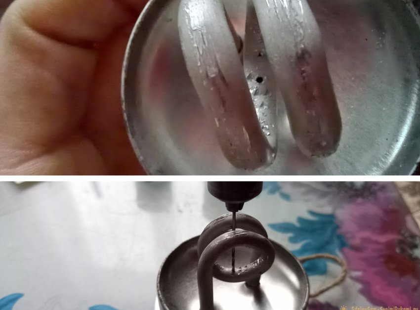 Затем следует просверлить посередине спирали, с внутренней стороны, тонкое отверстие в 1мм. СТРОГО под прямым углом! Чтобы в дальнейшем, при нагреве, струя пламени била точно вертикально, между витками спирали. Разводим витки спирали миллиметра на 3-4 друг от друга, и сверлим.