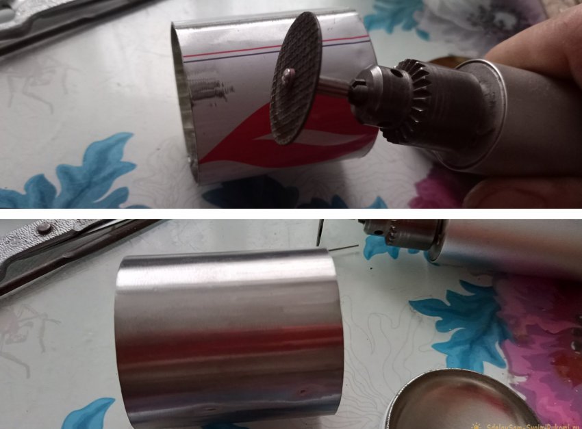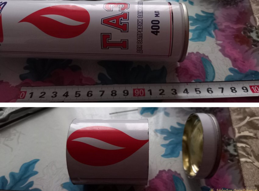 Теперь сделаем из пустого баллона небольшой поддон, между емкостью и спиралью. Нужен он для того, чтобы в него налить небольшое количество горючего и поджечь его, для прогрева спирали и запуска процесса испарения спирта. Да и, какая-никакая, а прослойка будет, чтобы сама емкость меньше нагревалась. Также из баллона вырежем и подставку для кружки, которая будет одновременно и защитой от ветра. Итак, отмеряем от дна баллона 15 мм, и отрезаем вместе с донышком. А затем отмеряем еще 60 мм – это будет подставка.